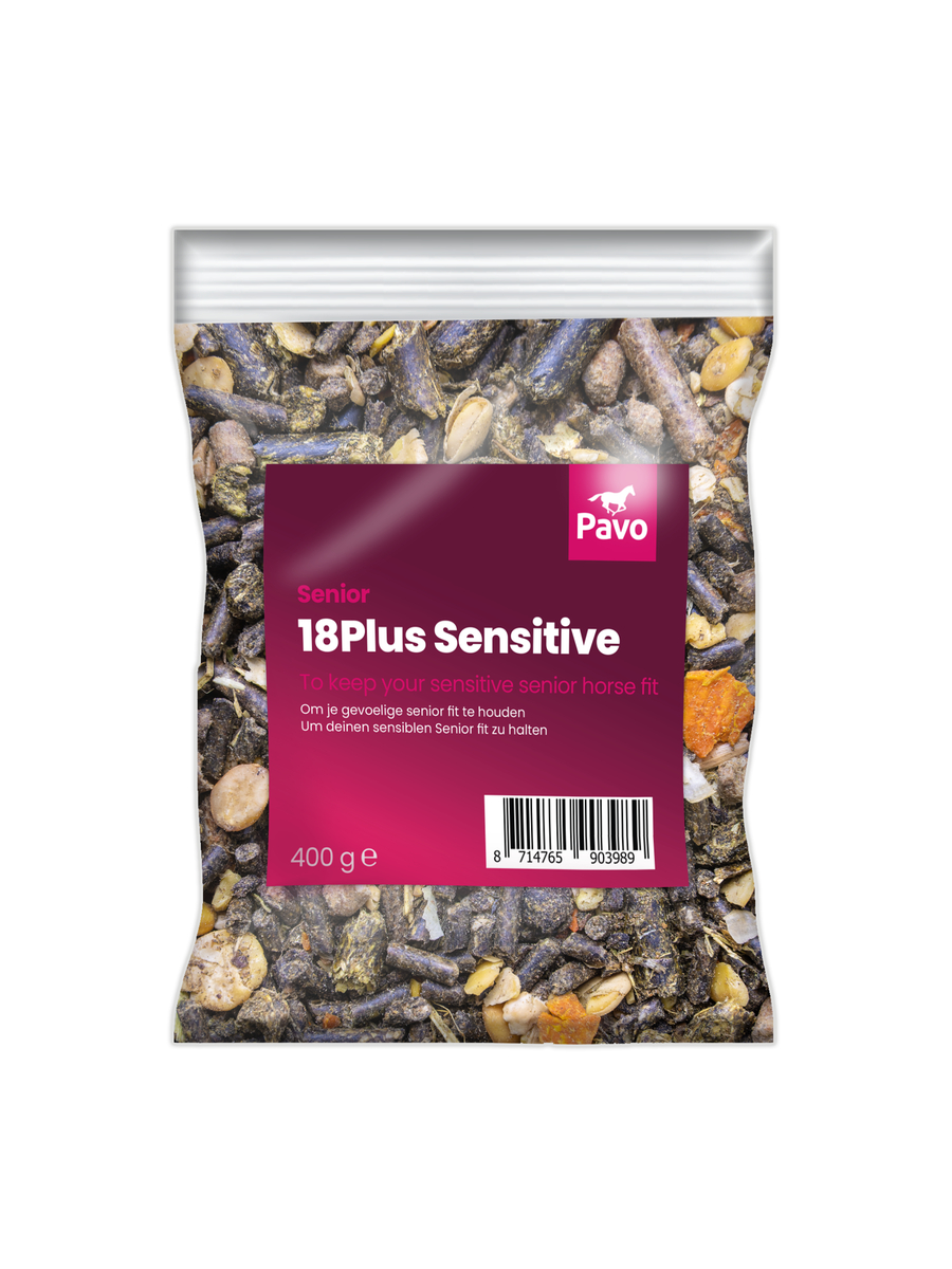 När hästar åldras uppstår ofta flera utmaningar kopplade till foder och matsmältning. En äldre hästs matsmältning blir mindre effektiv. Det innebär inte bara att vissa näringsämnen behöver tillföras i större mängder, utan även att smältbarheten och kvaliteten på näringsämnena blir ännu viktigare. För att hålla din senior frisk och i god form är det viktigt att anpassa sig till dessa förändrade näringsbehov. Pavo 18Plus Sensitive är utrustad med en mängd ingredienser som tillgodoser seniorhästens specifika behov.